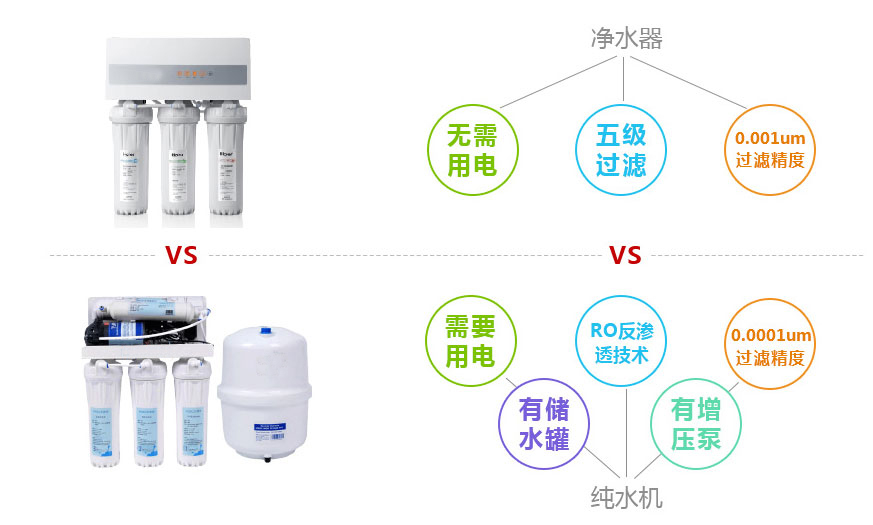 凈水機(jī)或者凈水器,是一個(gè)統(tǒng)稱,如果細(xì)化凈水機(jī)可以分為單級(jí)的超濾凈水器,比如霍尼韋爾、凱優(yōu)等就是有著不銹鋼外殼里面包含一根超濾膜的也可以叫凈水器或者凈水機(jī)。還有一種分級(jí)過(guò)濾的一般分為四級(jí)或者五級(jí)甚至更多級(jí),多采用的是PP棉,活性炭,顆粒炭,粉末炭,超濾芯,后置碳等組合在一起的也叫凈水機(jī)或者凈水器。這些所謂的凈水機(jī)或者凈水器都不需要用電源,過(guò)濾精度大多在千分之一微米或者更高一點(diǎn)。